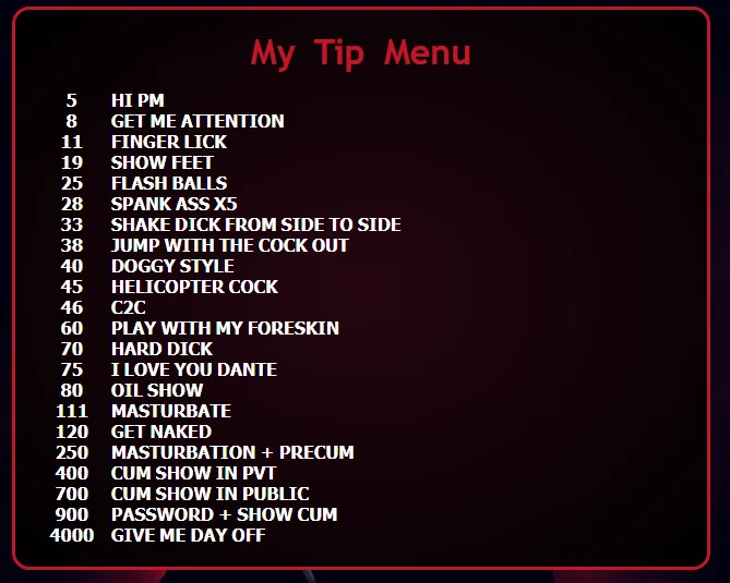 Ερωτικός χoρός, Βρωμόλογα, Κάμψεις, Τρίψιμο, Σόου με λάδι, Γιόγκα, Στα Τέσσερα, CEI, Στριπτίζ, Ποδολαγνεία, Ταπείνωση, Οδηγίες αυνανισμού, Αυνανισμός, Ποδομαλακία, SPH, Handjob, Ahegao, Εκσπερμάτωση, Βαθύ λαρύγγι, Βρώμικο παιχνίδι, Προχύσια, Οργασμός, Παιχνίδια για ρώγες